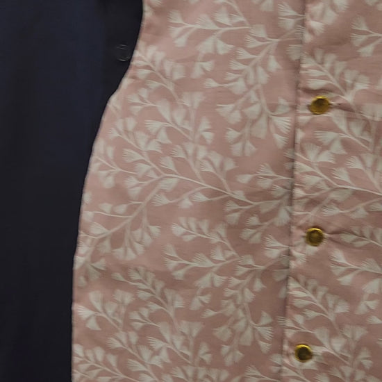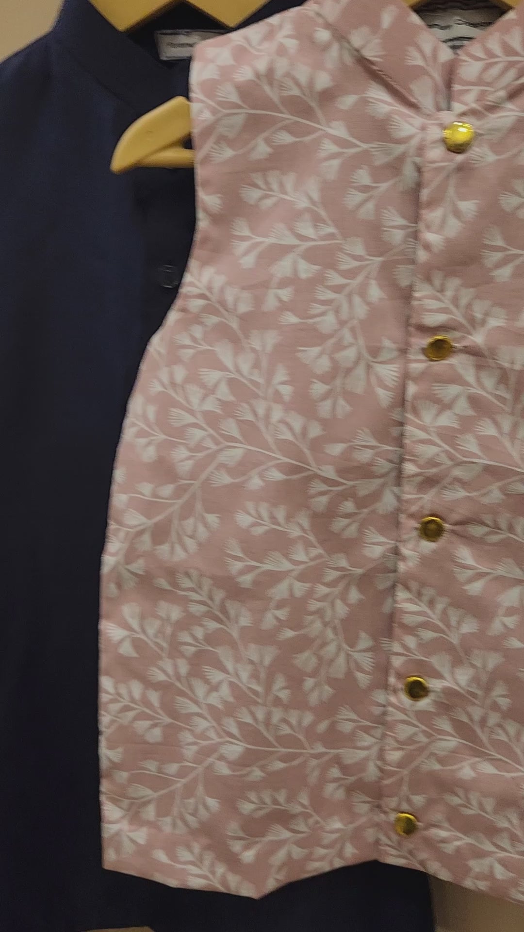 Dress your little one in charm with the Pink Floral Cotton Waistcoat paired with a Navy Blue Wash n Wear kurta and trouser – a blend of playful elegance and timeless style!