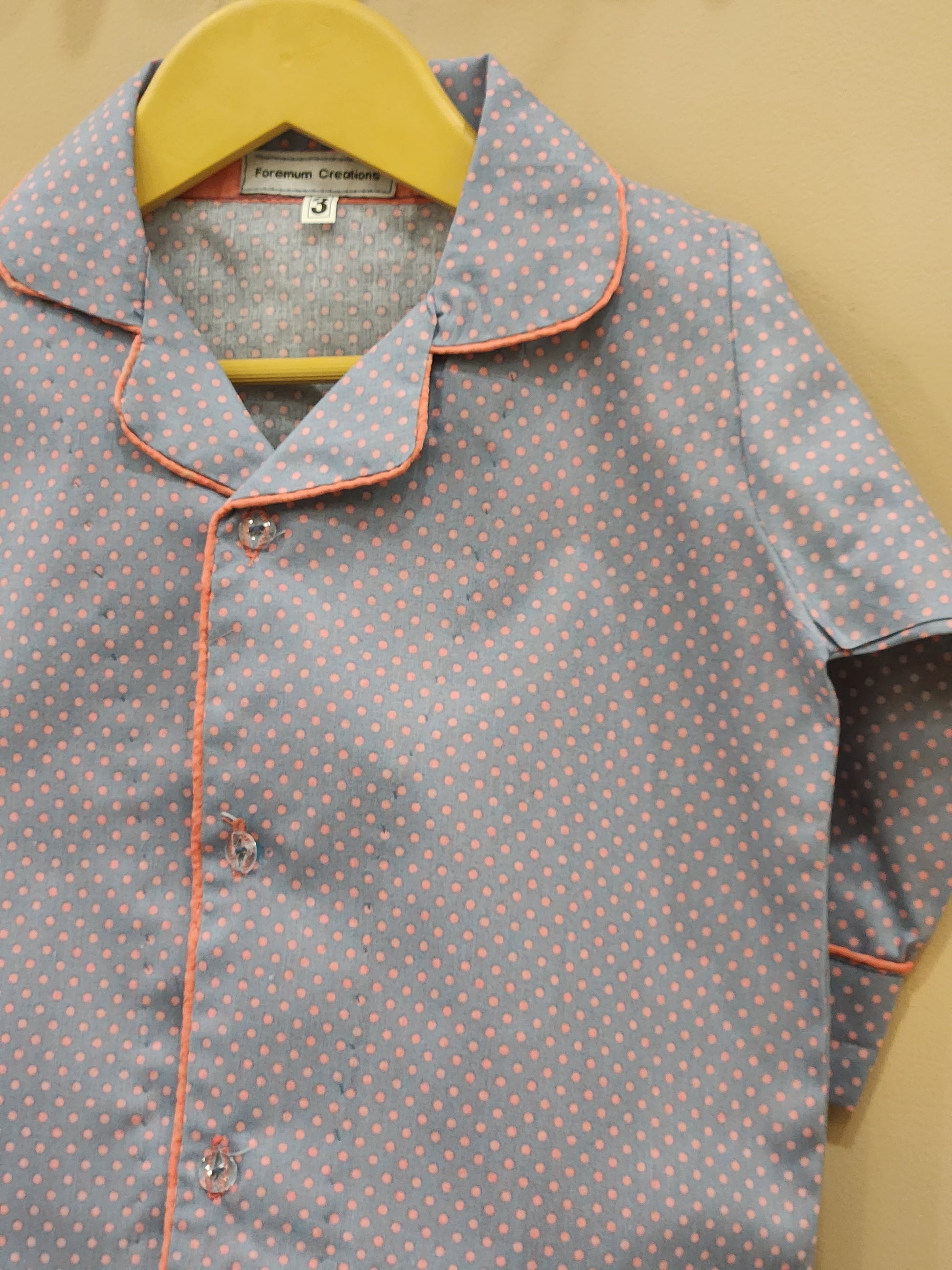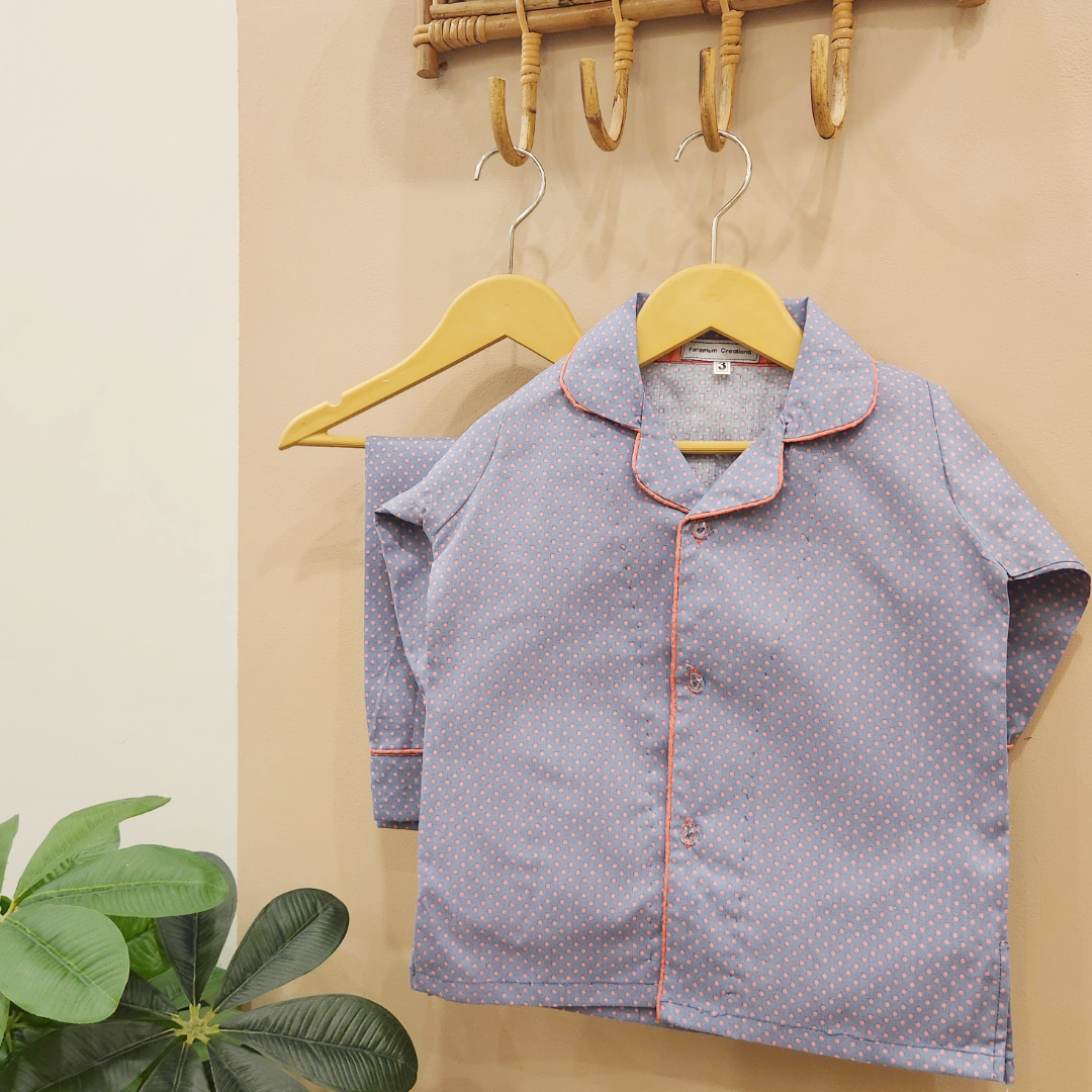 Float into dreamland with our Polka Breeze Nightsuit, featuring sweet pink polka dots on a soft grey-blue canvas—perfect for cozy, cheerful nights!
