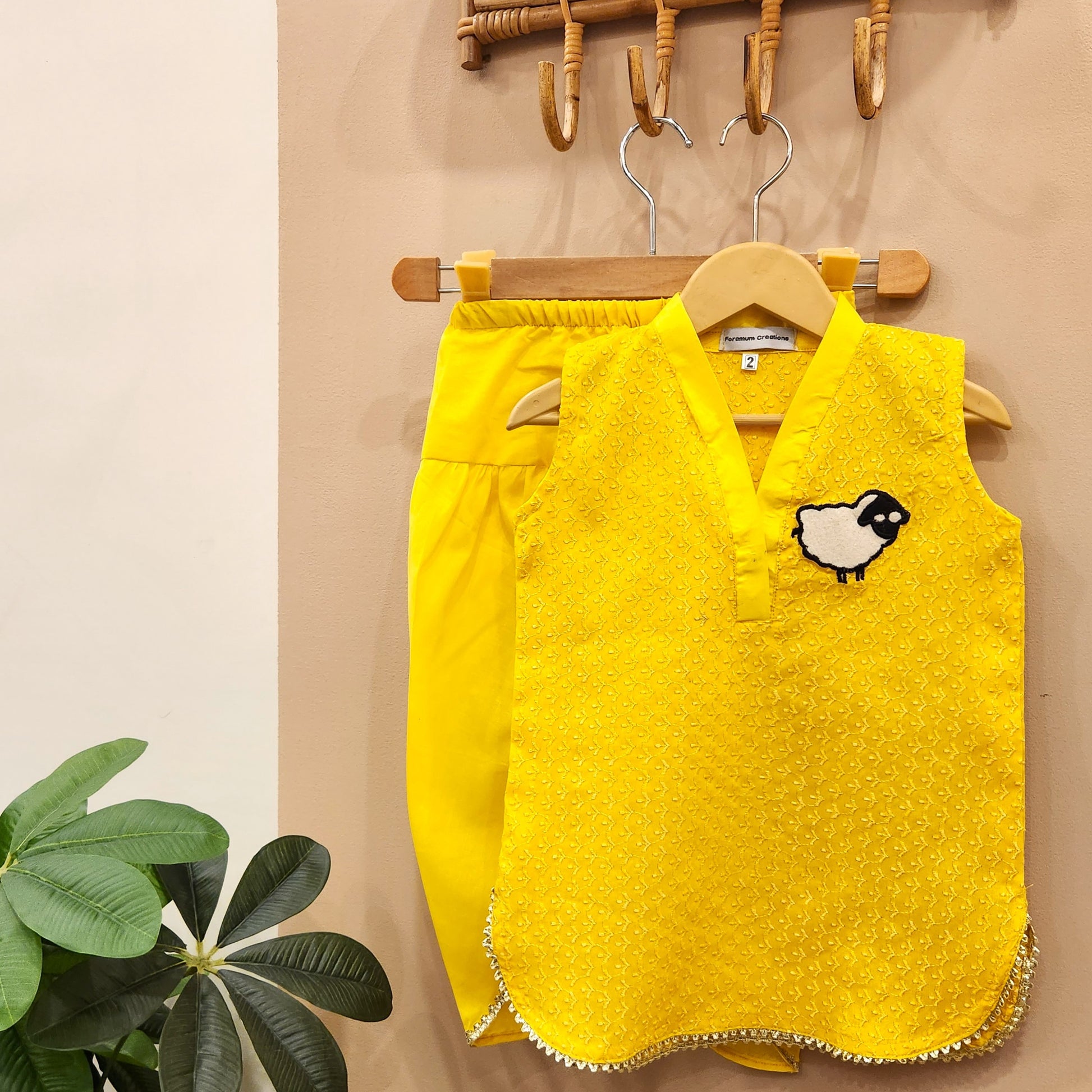 Radiating joy in every stitch, this yellow chikankari kurti with embroidered sheep pairs perfectly with a breezy cotton tulip shalwar — a cheerful pick for festive days and sunny celebrations.